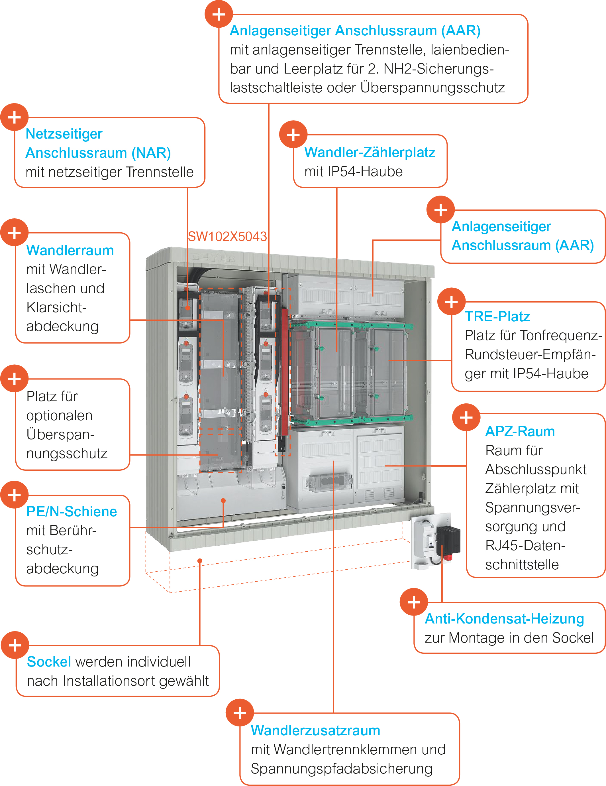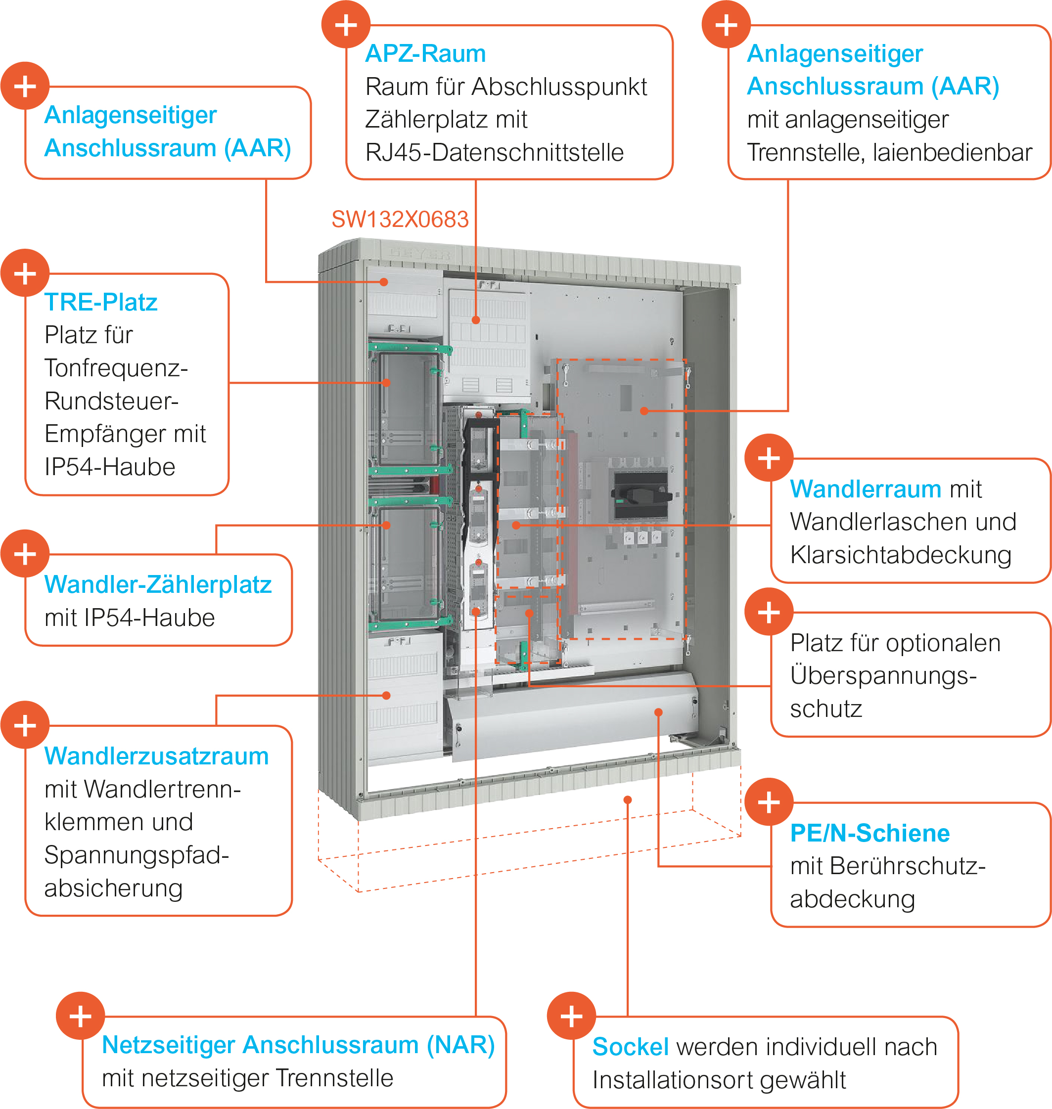Bei den Wandlerschränken von ABN werden die Anforderungen der DIN VDE 0603-2-2 umgesetzt. Außerdem werden die TAB der jeweiligen VNB angewandt. Nachfolgend werden die Funktionsräume anhand der Beispiele SW132X0683 (250 A Messung der Netze BW) und SW102X5043 (250 A Messung der Mitnetz Strom) thematisiert.